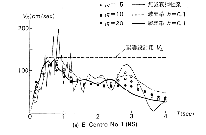 地震入力エネルギーの等価速度 VE と周期の関係を示したものがエネルギースペクトルである。図2には粘性系や履歴系に対して求められたエネルギースペクトルの例を示す。エネルギースペクトルは一種の応答スペクトルであるが、通常の応答スペクトルでは減衰が大きくなるに従い応答値は減少するのに対し、エネルギースペクトルではある一定値に収束する。すなわち、減衰が0の振動系への入力エネルギーは非常に変動が大きいものの、粘性減衰が増える、あるいは塑性化が大きな系になれば入力エネルギーが平滑化されることがわかっている。
